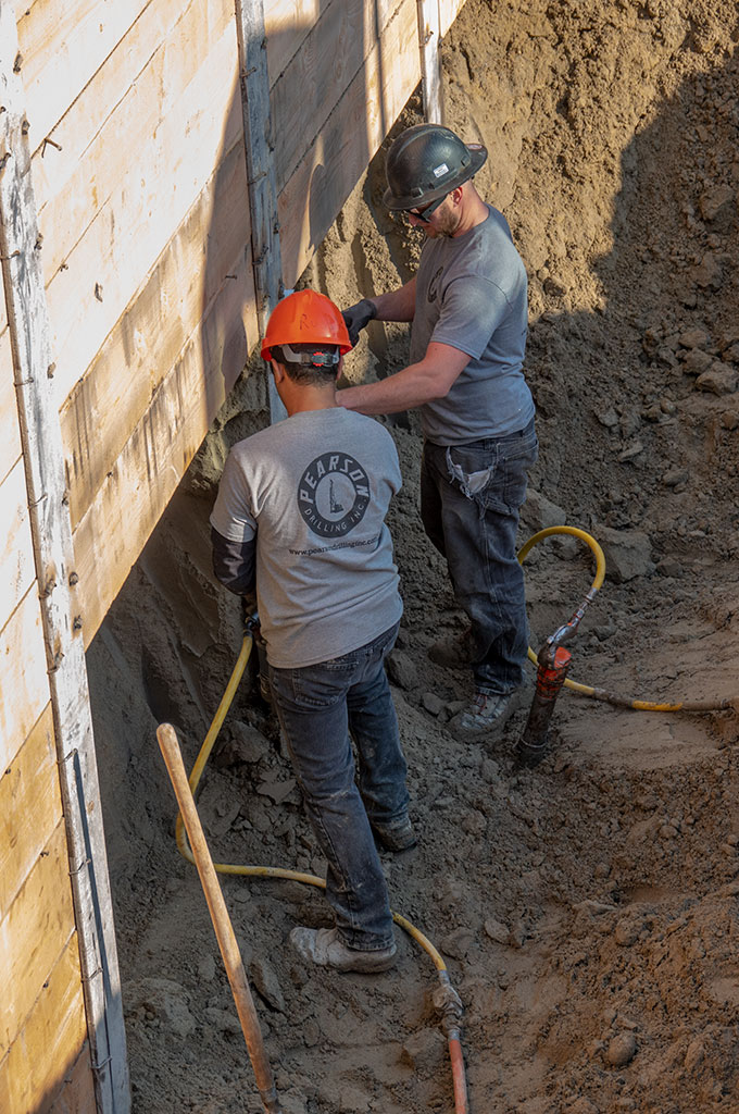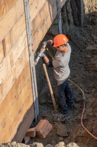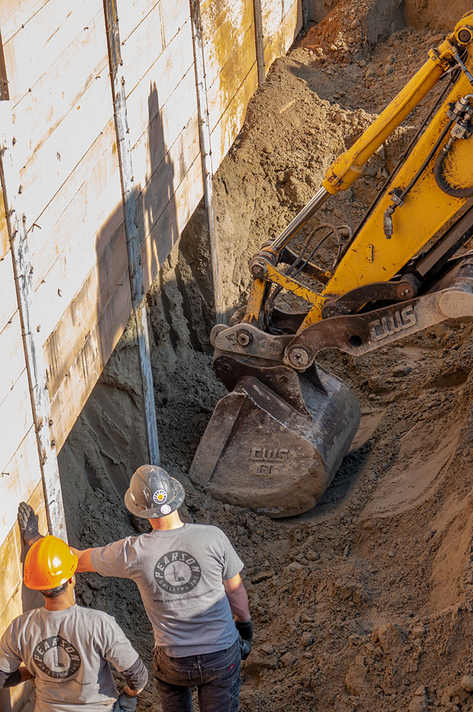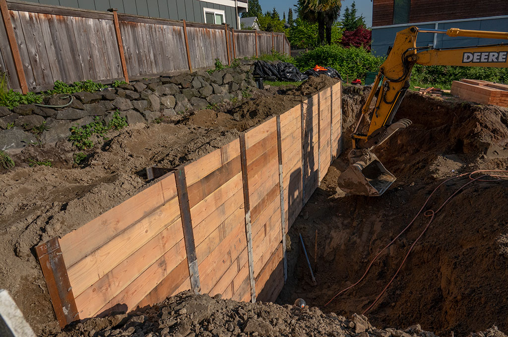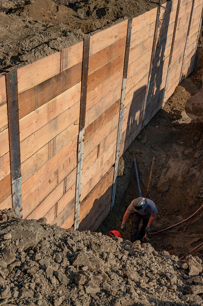 The temporary retaining wall was completed. They fill-in the spaces between the dead soldiers with 2″ x 14″(?) boards trimmed to fit in the I-beam channels. They start at the top, secure the trimmed boards with bent nails, and then dig down to place the lower boards. In all, the retaining wall was 13+’ high.