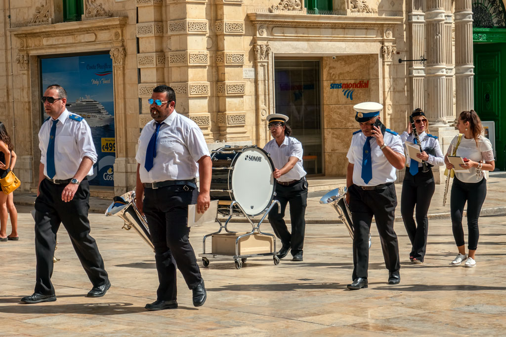 June 7 is a national holiday in Malta. Many of the stores and restaurants were closed. We were told there would be celebrations today, but no one told us what or where they. We did learn there would be a parade at 9:00 AM down Republica street. We started the morning with sweet pastries from Jeff’s Pastizzeria. Making coffee in the apartment was handicapped by not remembering how to use the Nescafe cartridge coffee machine. Thanks to the internet, we figured it out and got our coffee fix. Then we searched for signs of a parade. We found some musicians and followed them to the parade start location. It was early, so we checked out the nearby Triton Fountain and the city wall.