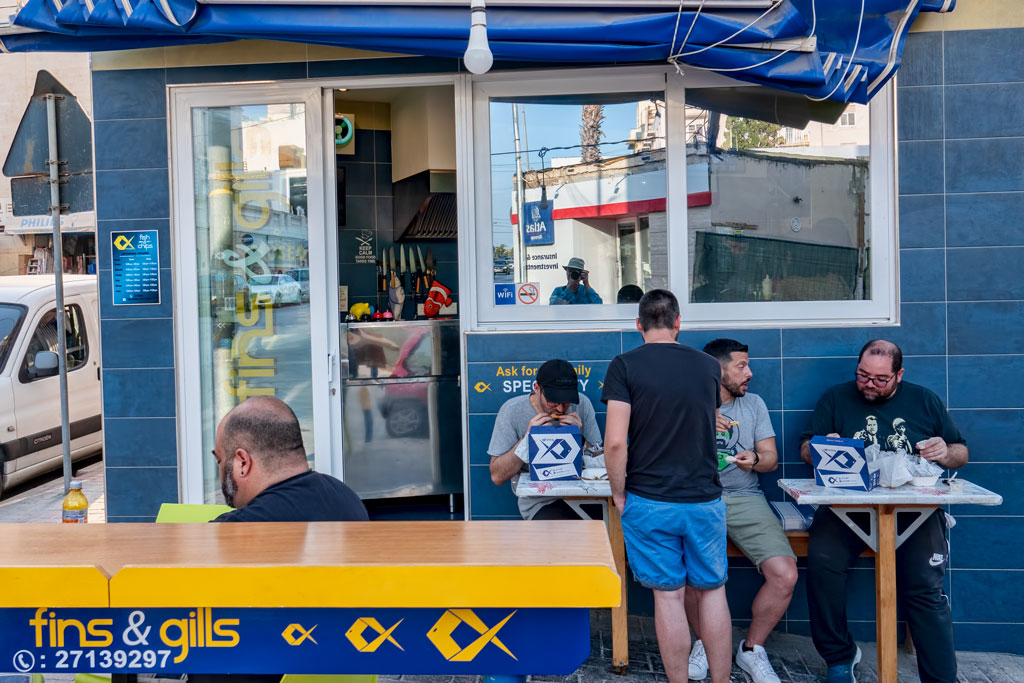 After touring Mdina, we took another BOLT car hire back to our condo and rested. For dinner we had fish & chips at Fins and Gills. It is a two person operation with outside eating or take away. The shop was tiny. There was barely enough room to Marty & I to place our order. The two guys behind the counter were a hoot. We discussed their having good, fresh, fish and how it affected the price. Also, we discussed my eating fish & chips with my ketchup vs. ketchup with fish & chips. They gave us lots of ketchup 🙂