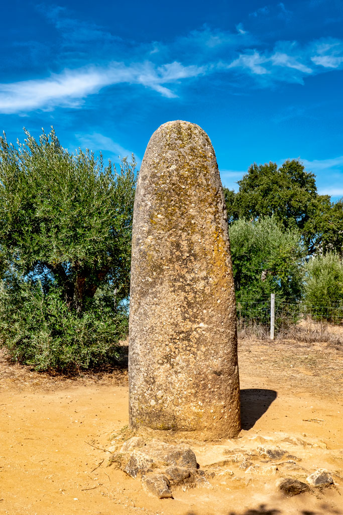 The Almendres Menhir (Menhir de Almendres) is single standing stone near Evora in Portugal dating from 5000-4000 BC. Standing about 4 meters high, it has some faint markings near the top. It is aligned with the nearby Almendres Cromlech roughly towards the sunrise on the winter solstice. Local legend has it that the menhir is the tomb of an enchanted Moorish princess, who can be seen combing her hair once each year on the eve of São João.