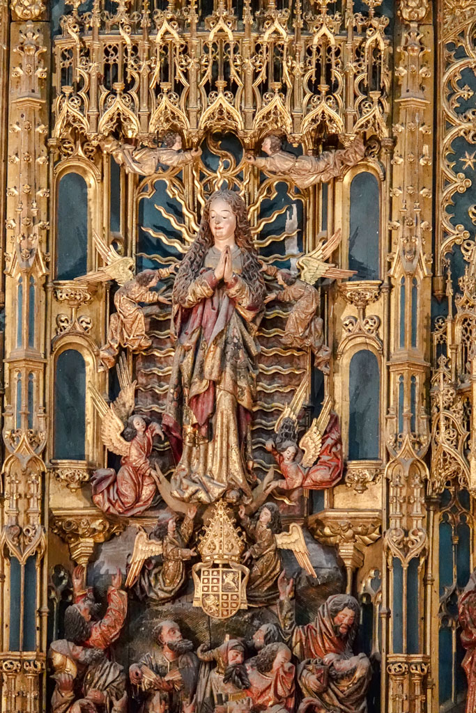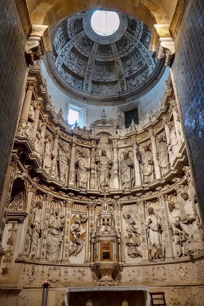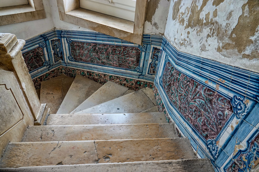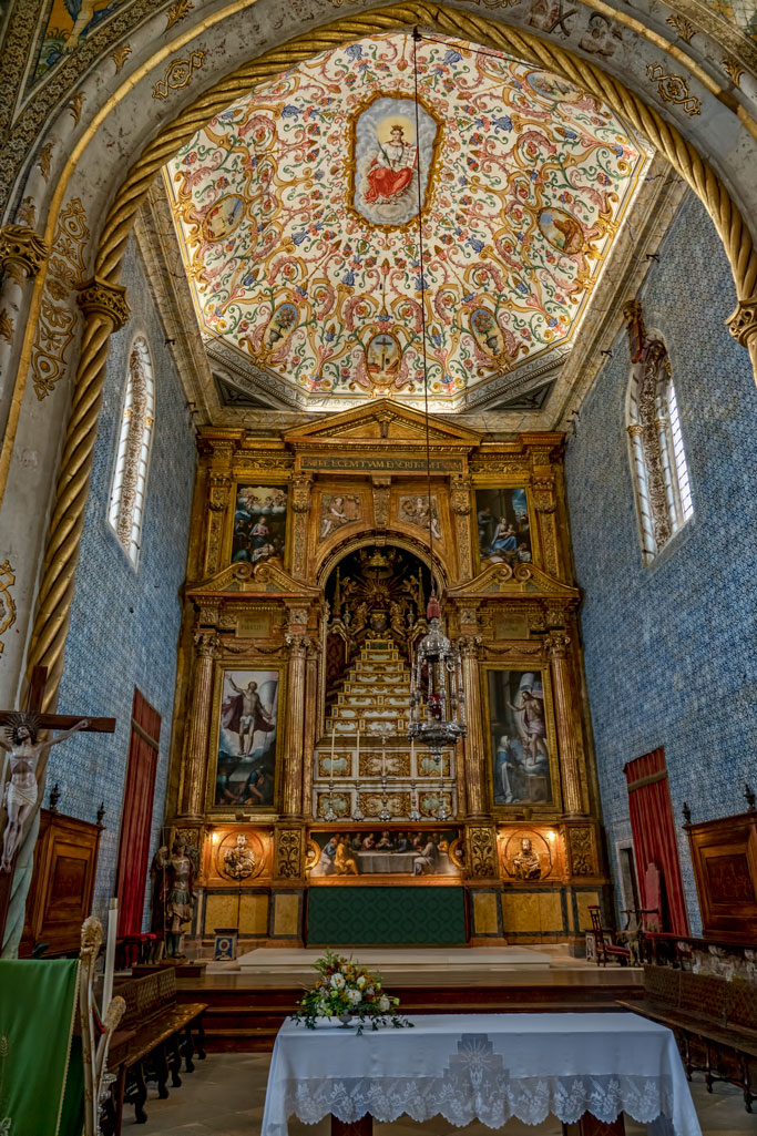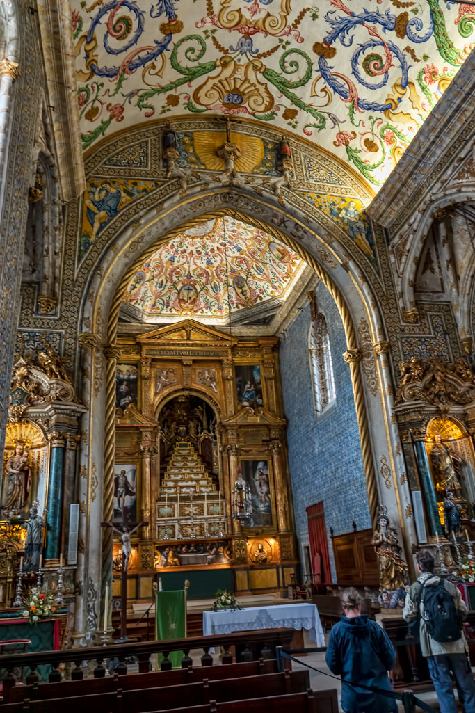 This chapel is behind a 16th-century facade (enter through door to the right of facade—once inside, knock on the door on the left marked capela). The architecture of the church interior is Manueline—notice the golden “rope” trimming the arch before the altar. The chapel was begun in 1517, but much of the decor is from a later time. The altar is 17th-century Mannerist, with steps unique to Portugal (and her South American colonies); based on Jacob’s Ladder, they symbolize the steps the faithful take on their journey to Heaven.The “carpet tiles” covering the walls date from the 17th century and kept the chapel cool in the summer. The 2,100-pipe, 18th-century German-built organ is notable for its horizontal “trumpet” pipes. Found only in Iberia, these help the organist perform the allegorical fight between good and evil—with the horizontal pipes trumpeting the arrival of the good guys. The box seats for the royal family are high above the musicians’ loft in the rear. Students and alums enjoy the privilege of having their weddings here.