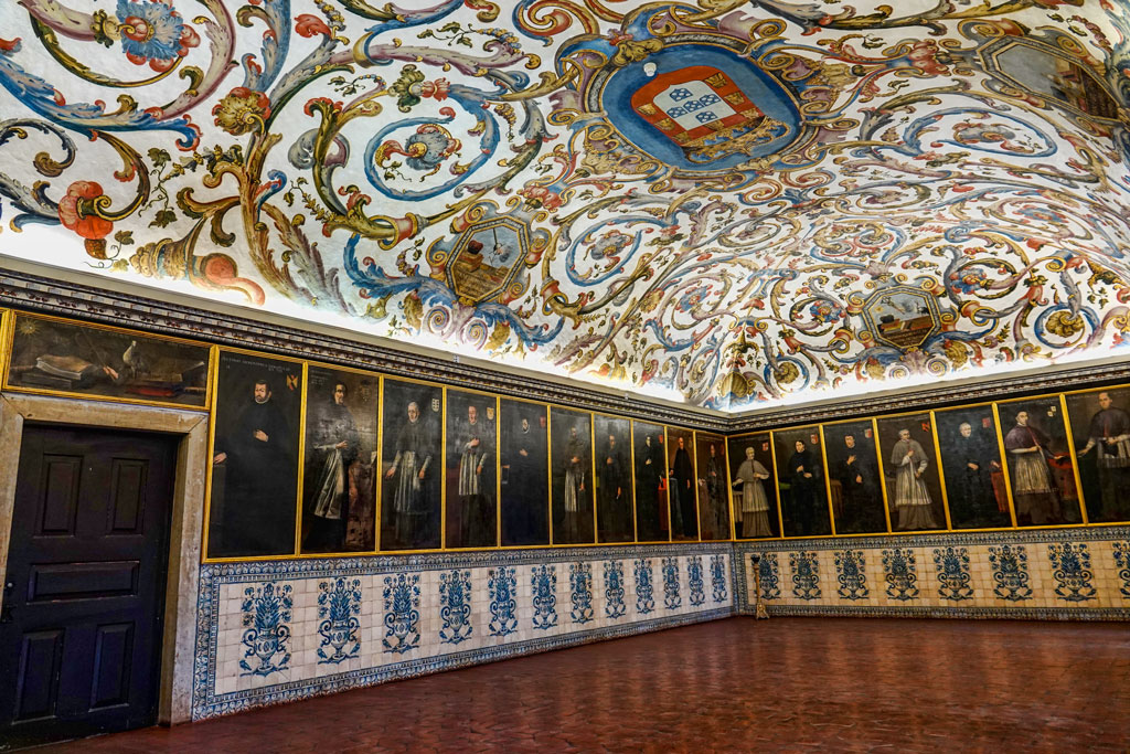 From the middle of the Via Latina, climb the tiled stairway. Follow the route through an ornate room, then trudge around a narrow hallway, where you can peek out from little balconies into the Grand Hall—the site of the university’s major academic ceremonies, such as oral exams and graduations. This regally red room was originally the throne room of the royal palace. Today, the rector’s green chair sits like a throne in front. During ceremonies, students in their formal attire fill the benches, and teachers sit along the perimeter as gloomy portraits of Portuguese kings watch from above.